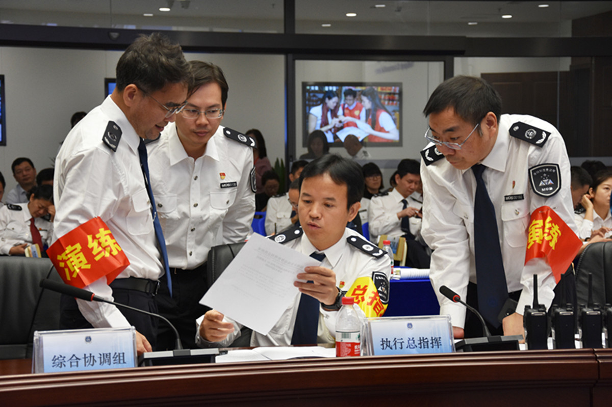 为了全面贯彻落实党的十九届四中全会和《中共中央 国务院关于深化改革加强食品安全工作的意见》,进一步提高全市重大活动食品安全事故应急处置能力,扎实推进中国特色社会主义先行示范区食品安全领域治理体系和治理能力现代化,2019年11月21日上午,由深圳市食药安办、市市场监管局主办,由国家药品监督管理局安全应急演练中心技术指导的2019年深圳市重大活动食品安全事故应急演练在市场监管局智能指挥中心成功举办。市食药安办副主任,市市场监管局党组成员、副局长李忠参加演练并讲话。市委宣传部、市公安局、市应急管理局、市卫生健康委及我局指挥处、食药协调处、食品生产处、食品经营处、福田局、市检测院、市标准院等有关同志参加了本次演练;市委网信办、市商务局、市接待办、各区(新区、特别合作区)食药安办、各重大活动供餐单位代表及市市场监管局相关处室、各辖区、技术机构等共80多人观摩了此次应急演练。