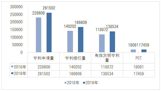 (一)专利申请和授权量。2019年,深圳市知识产权创造数量及质量均取得突破,全市专利申请量、授权量、授权量增速、有效发明专利五年以上维持率、PCT国际专利申请量五项核心指标居全国第一,创新环境进一步优化。2019年,深圳国内专利申请量达261,502件,同比增长14.39%;其中发明专利申请82,852件,同比增长18.41%。国内专利授权166,609件,同比增长18.83%;其中发明专利授权26,051件,同比增长22.25%。截至2019年底,深圳累计有效发明专利量达138,534件,同比增长16.54%。每万人口发明专利拥有量达106.3件,为全国平均水平(13.3件)的8倍。有效发明专利五年以上维持率达85.22%,居全国大中城市首位(不含港澳台地区)。PCT国际专利申请量17,459件,同比下降3.44%,降幅较去年大幅收窄8.17%,约占全国申请总量(56,796件)的30.74%(不含国外企业和个人在中国的申请),约占全省总量的70.61%,连续16年居全国大中城市首位。