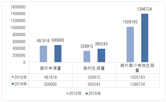 (二)商标申请和注册量。2019年,深圳市商标申请和注册量保持增长趋势,全市商标申请量500,905件,同比增长3.96%;商标注册量395,243件,同比增长20.90%;截至2019年底,深圳累计有效注册商标量1,396,734件,同比增长36.11%,有效注册商标量居全国大中城市第三名。