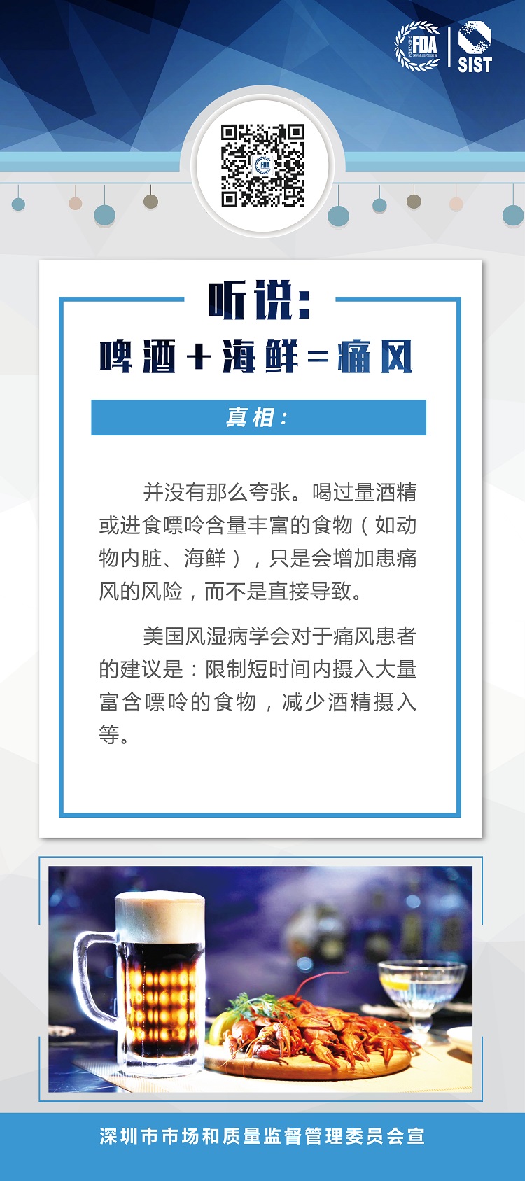 真相:并没有那么夸张。喝过量酒精或进食嘌呤含量丰富的食物(如动物内脏、海鲜),只是会增加患痛风的风险,而不是直接导致。