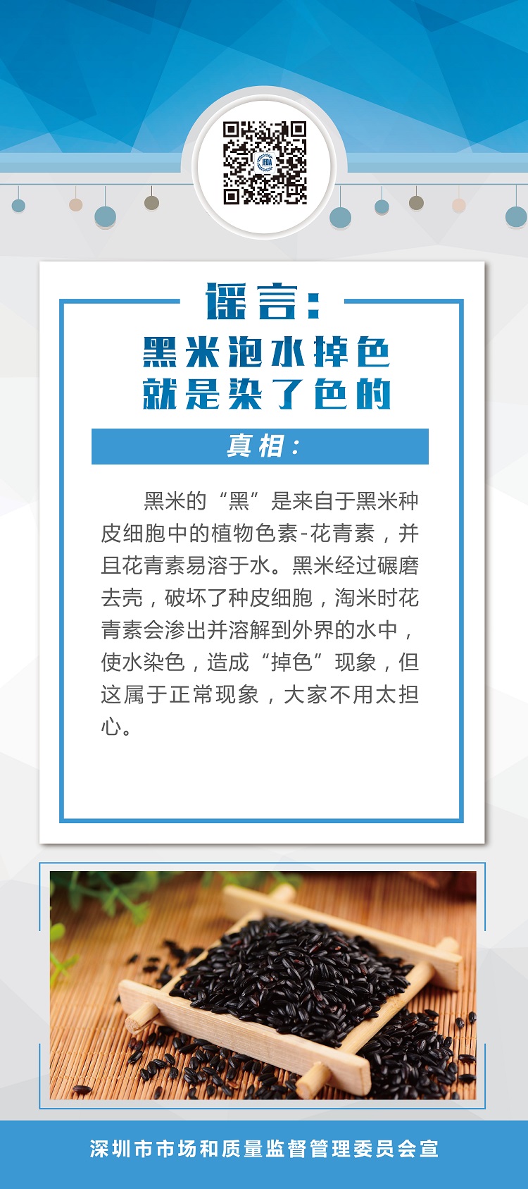 真相:黑米的“黑”是来自于黑米种皮细胞中的植物色素-花青素,并且花青素易溶于水。黑米经过碾磨去壳,破坏了种皮细胞,淘米时花青素会渗出并溶解到外界的水中,使水染色,造成“掉色”现象,但这属于正常现象,大家不用太担心。
