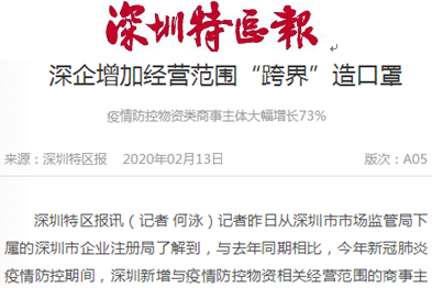 新冠肺炎疫情暴发以来,医疗器械、口罩、防护服、消毒液作为疫情防控的“标配”缺口巨大。最近,企业“跨界”造口罩成为热点。比亚迪宣布调配资源,着手防护物资生产设备的设计和制造,援产口罩和消毒液,以满足当前对防护物资的迫切需求。富士康、中石化等企业也加入到“跨界”生产大军。据深圳市企业注册局的最新统计,1月1日至2月10日,深圳办理变更增加相关经营范围的商事主体共352家。与去年同期相比,今年疫情防控期间新增加相关经营范围的商事主体大幅增长73%。增加经营范围的企业,部分是从其他制造业以及科技业转产,目前正紧锣密鼓地组织资源完成生产线改造。