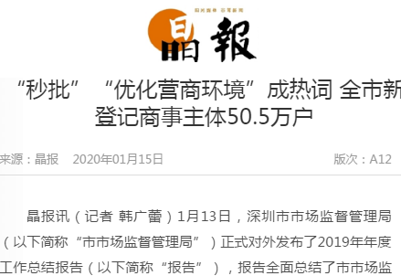 记者还从深圳市企业注册局获悉,2019年深圳新登记商事主体50.5万户,较上年同期增长4.2%。其中企业300806户,同比增长3.4%,个体户204321户,同比增长5.5%。截至2019年12月底,全市累计共有商事主体327.7万户,其中企业204.3万户,个体户123.4万户,全市商事主体总数位居全国大中城市第一,创业密度居全国大中城市第一。